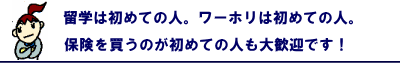 ![]() 留学保険・ワーホリ保険が よく分かると好評を頂いてます。 WEB上で見れない特別プランも 含め多数のプランの資料同封。 お申込には資料に同封される 手続書類が必要となります。 ![]()